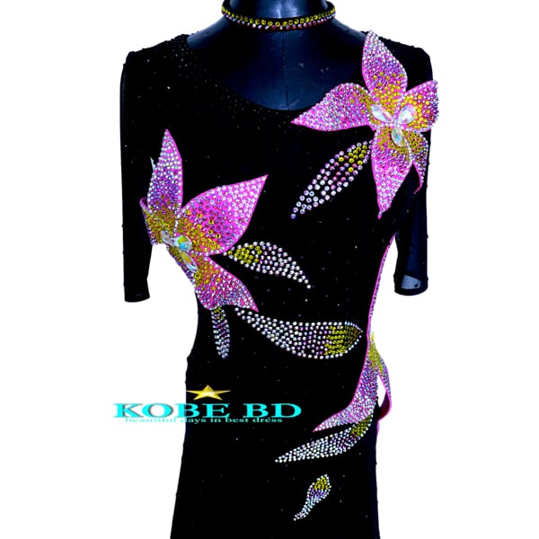 種目はオールマイティーで、チャチャ、サンバ、ルンバ、ジャイブ、何にでも合います♪勿論、競技にも。黒を使ってさりげなく、スラリと見せる効果も入っていて嬉しいですね。ご検討板だければ嬉しいです!
