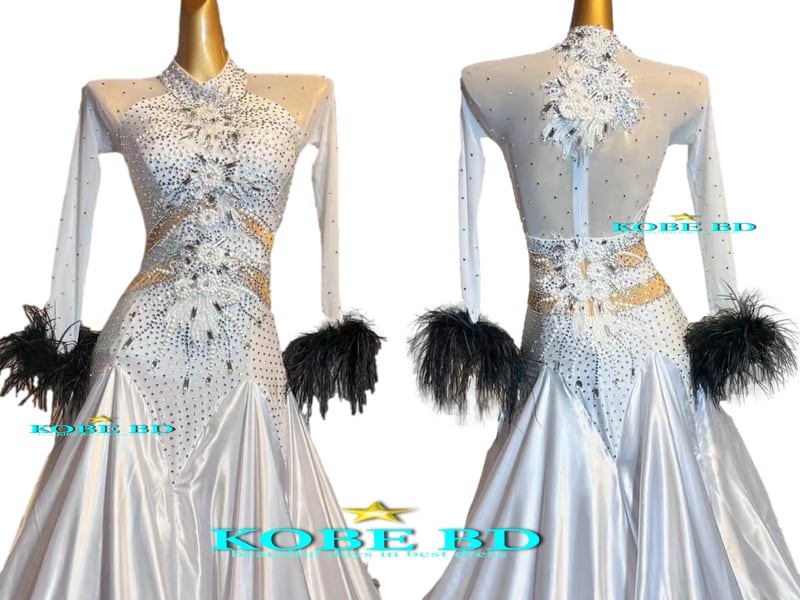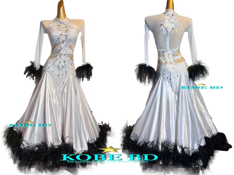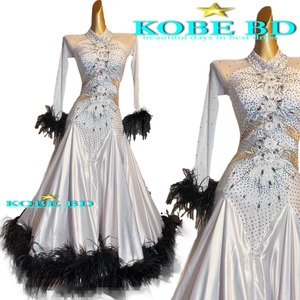 ボディはメッシュネットを使い、白ドレスながらも包み込んだ暑い雰囲気がありません。スカートにはフェザーを施し特別感。パーティーデモ、競技にもフロアに映える一枚です。